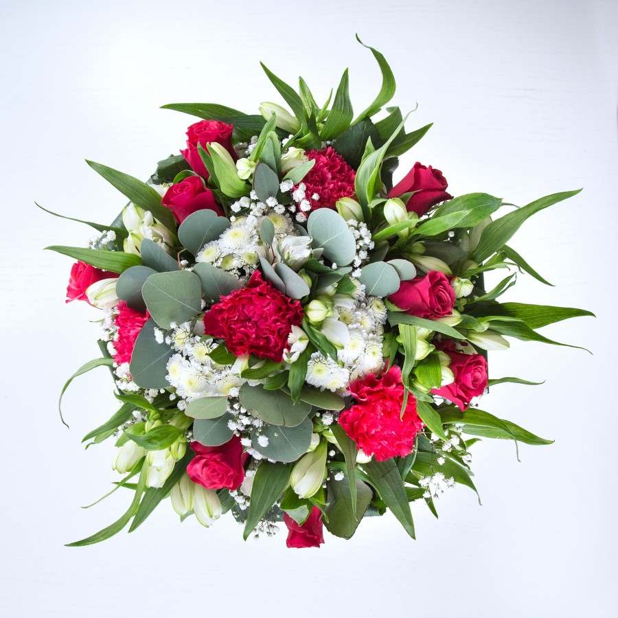 Embrace serene elegance with our Red & White Bliss Bouquet. This beautiful arrangement showcases immaculate white chrysanthemums and gypsophila paired with vibrant red roses and carnations. Complemented by white alstroemeria and aspidistra leaves, each flower is thoughtfully arranged to create a blissful and unique bouquet.