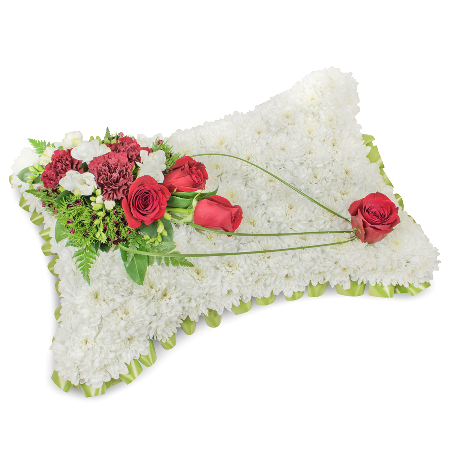Extend your deepest sympathies with our graceful floral arrangement, combining white chrysanthemums, red roses, white freesias, and dark red carnations. Complemented by delicate dianthus and bear grass, this bouquet is designed to offer comfort and beauty in a unique presentation.